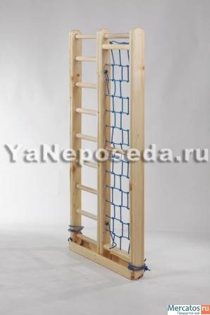 - Каркас комплекса изготовлен из сосны, перекладины шведской стенки и рукохода (на них идет самая большая нагрузка) из бука, гладиаторская сетка (полипропилен);