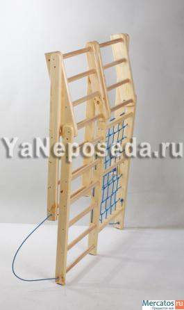 - Каркас комплекса изготовлен из сосны, перекладины шведской стенки и рукохода (на них идет самая большая нагрузка) из бука, гладиаторская сетка (полипропилен);
