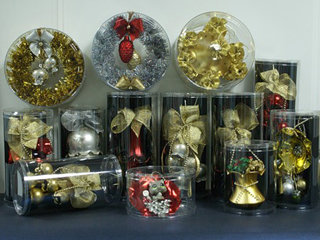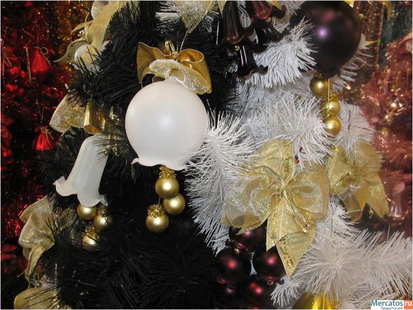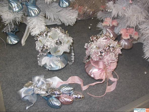 Упор сделан на ручную работу. Ёлочные украшения отличаются по форме - ломаные шары, шары с отверстиями, необычные композиции с ленточками, бусинками и другими украшениями.
