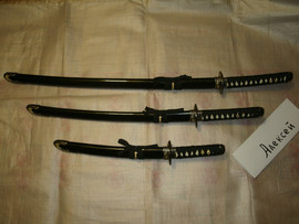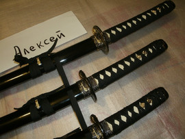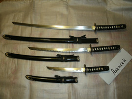 Катана, вакидзаси и танто на подставке.Ножны метал,хлопковая тесьма, клинок метал. Не является оружием (сувенир).
