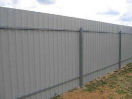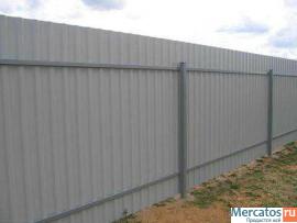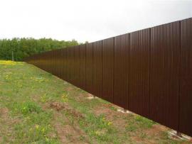 Для столбов забора используют профильные трубы. Столбы устанавливают в отверстия глубиной 0,75 м через 2,5м и выполняют заливку бетоном. Профлист крепят саморезами внахлест через волну.
