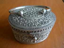 Прекрасный подарок - cеребряная шкатулка великолепного исполнения, в которой филигрань, чеканка и пайка приобретают вид ковра из цветов. Удобная большая ручка, крышка плотно закрывается на защелку. Шкатулка не только красивое ювелирное изделие, но и может использоваться для хранения украшений. Изготовлена в середине ХХ вв. Состояние отличное.