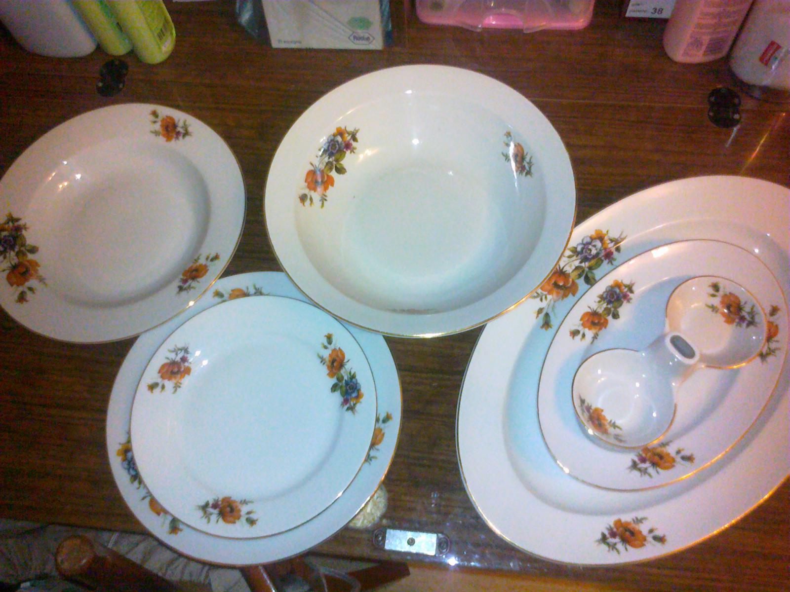 | 1. сервиз столовый 22 предмета ( Болгария): по 6 тарелок для "первого", "второго" и десерта, 1 большое глубокое блюдо... |