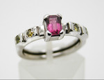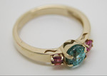 | Золотое кольцо с нат. голубым цирконом и розовыми турмалинами.