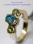 | Золотое кольцо с нат. голубым цирконом и турмалинами.