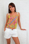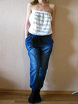 | Низ джинсовый в низу на небольших свободных резинках. Стильный и красивый верх из белого шелка и мелкой сетки с надписью и стразами. Идеально сидит, подчеркивая фигуру. Производство фабричный Китай. |