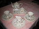 | 14 предметов чашки с блюдцами и два чайника(заварочный и для кипятка).Цвет в виде рисунка золотистого и фисташкового. |