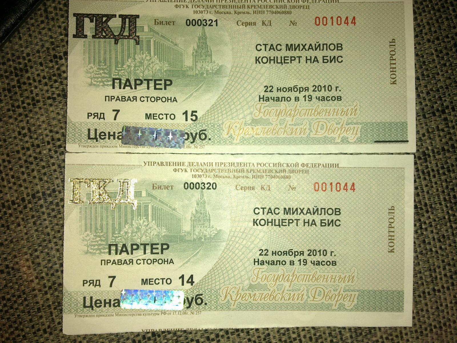 | 89260204481-Антон: Два билета на концерт Стаса Михайлова 22-ноября в Кремлевском Дворце, места рядом со сценой, партер середина ряд-10 места-36,37. продам ниже указаной цены на билете! |