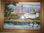 | Лебеди .Ручная работа Вышивка счетный крест. канва материал100% шерсть размер 46х36 рамка+стекло цена 15000р |