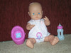 | В комплекте кукла, одежда (которая на ней), соска, горшок, бутылочка. Кукла умеет пить, писать и пускать пузыри.Ручки и ножки двигаются при помощи хозяйки. В хорошем состоянии. |